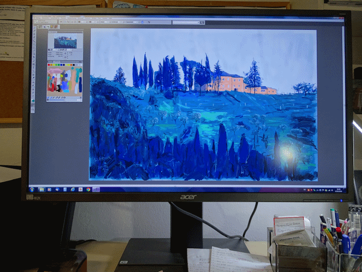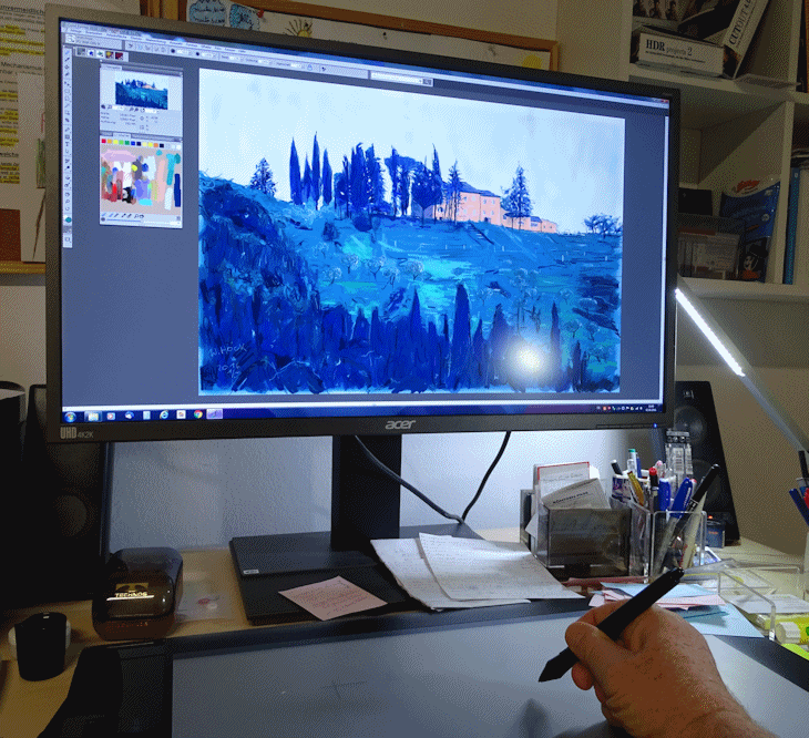 Eine neue Technik ist das Malen und Zeichnen per Hand direkt im Computer, um dann gedruckt zu werden auf Papier oder Leinwand. Die heutigen Geräte haben sich derart verbessert, dass man schnell und frei mit Farben und Linien arbeiten kann. Man malt nicht mehr auf wirklichem Papier oder wirklicher Leinwand, sondern auf virtuellem Papier im Computer. Es geht dabei nicht darum, andere Medien oder Materialien (z.B. Öl- oder Aquarellmalerei) vorzutäuschen, nachzumachen oder zu reproduzieren, sondern die Eigenheiten des neuen Mediums zu erforschen und anzuwenden. Dabei stößt man – wie bei allen Medien – auf Vor- und Nachteile. Vorteile sind z.B. die Schnelligkeit beim Farbenwechsel, bei der Korrigierbarkeit und bei der Trocknung (die es hier nicht gibt), was den intuitiv spontanen und direkten Umgang mit den Bildern fördert. Schnelligkeit hier im positiven Sinne, nicht als nervöses Herumprobieren.Das braucht Zeit, höchste Konzentration und macht viel Arbeit, und wie bei den traditionellen Kunstmedien hat es auch immer mit Können zu tun. Für bestimmte Dinge ist dieses Medium einfach perfekt. Vor allem kann man sehr fein mit transparenten Farbschichten arbeiten und bestimmte Farbtönungen erzeugen, die in anderen Techniken so nicht möglich sind. Man kann diese neue Technik mit traditioneller Druckgraphik vergleichen: Die bearbeitete Kupferplatte ist das virtuell erzeugte Bild im Computer, von dem dann, nach vielen Zustandsdrucken, Originaldrucke hergestellt werden in einer bestimmten Auflage. Es handelt sich also nicht um Reproduktionen. Für mich stellt dieses neue Medium eine wichtige Erweiterung dar, das unserer Zeit entspricht. Das bedeutet aber nicht, dass ich deshalb die traditionellen Medien wie Öl- oder Aquarellmalerei vernachlässigen werde. Im Gegenteil: Dinge, die man in den neuen Medien entwickelt hat, befruchten die Arbeit in der Ölmalerei und umgekehrt. Die kreativen Möglichkeiten erweitern sich dadurch in allen Medien und für mich ist es immer wieder überraschend, was dabei herauskommt. Absolut faszinierend. von Wolfgang Hock